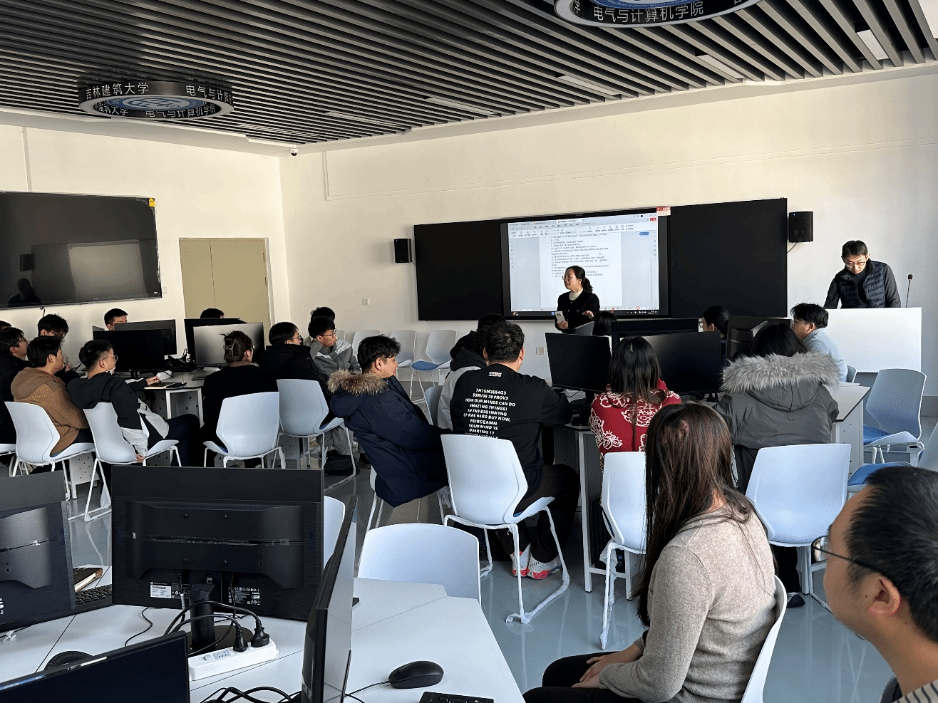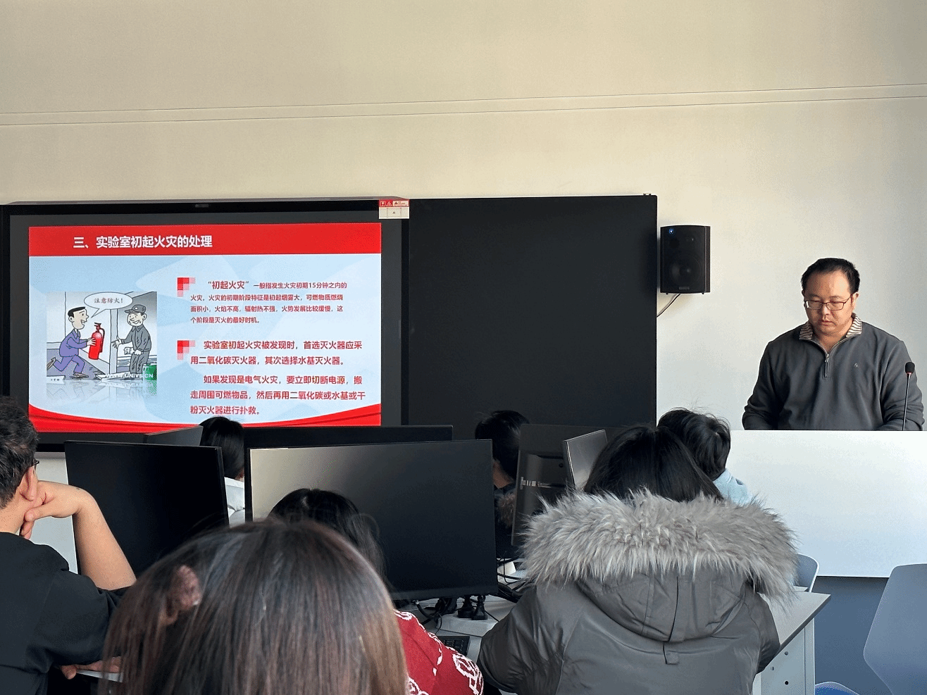 随后,实验室多位老师结合各自分管领域进行了专题讲解。高寒松老师详细解读了实验室日常使用管理制度,重点强调了实验室准入考试与仪器设备使用考试的硬性要求,并严正指出了实验室内违规用电的危害,明令禁止私自串接插排、使用手机充电器等违章行为,从源头上杜绝电气安全隐患。杨帆老师则为同学们系统讲解了实验室消防安全知识,包括消防设施的正确使用方法、初期火情的应对策略及应急疏散流程,并现场演示了灭火器的操作步骤。高婷婷老师围绕化学药品的规范管理进行了细致说明,要求全体研究生必须严格执行使用前登记、按需精准取用及分类、合规处理废液的原则,确保危化品管理的全链条安全可控。